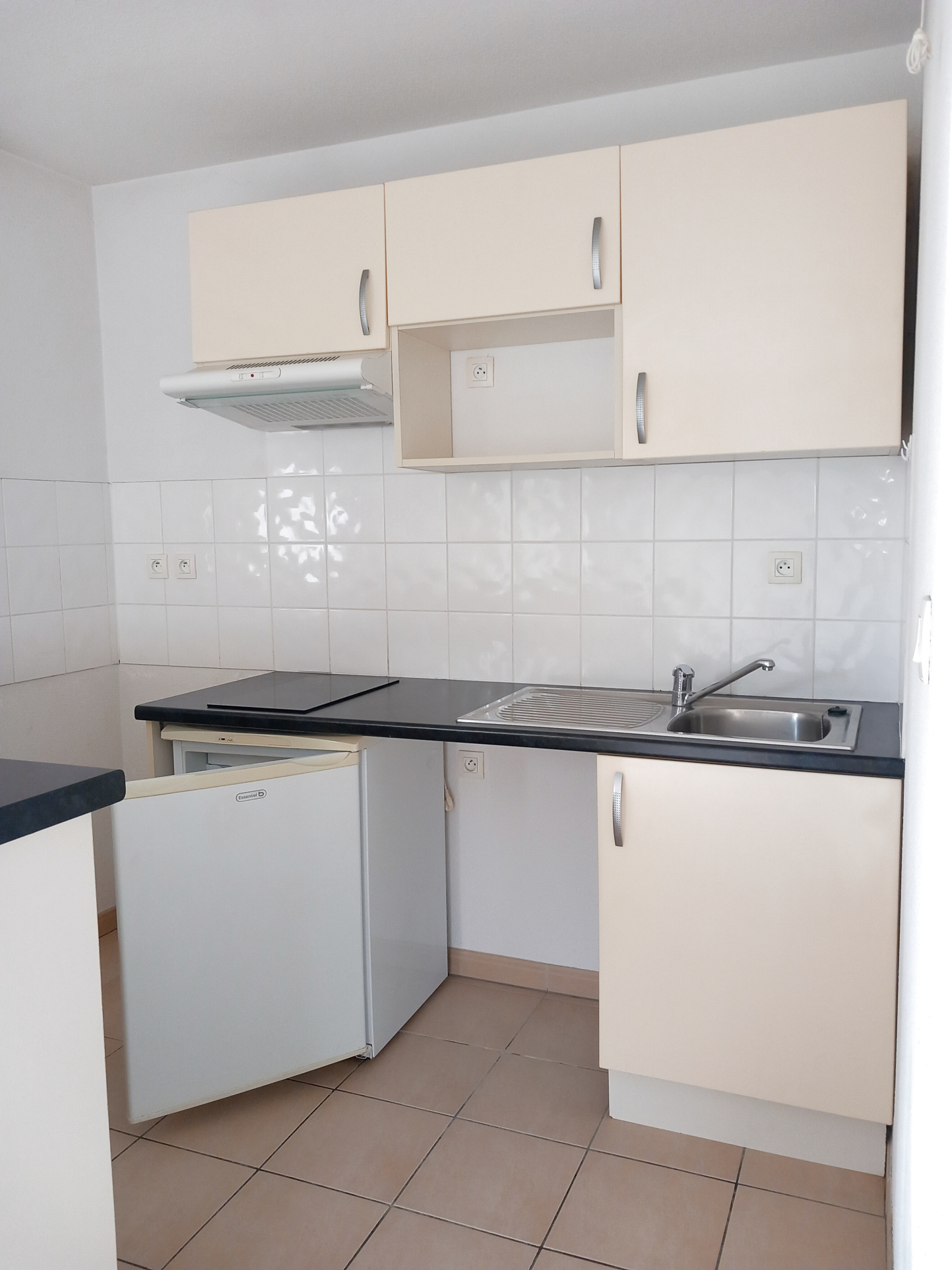 Marmande, Résidence Cosilodge, 1er étage, agréable appartement T2 avec balcon et place de parking, comprenant : entrée avec placard, séjour ouvert sur coin cuisine semi-équipée (rangements, plaque de cuisson, hotte aspirante, petit réfrigérateur), chambre avec placars, salle de bains et wc. Disponible - Loyer mensuel hors charges : 457€ + 46€ charges (parties communes et consommation d'eau froide) - Dépôt de garantie : 457€